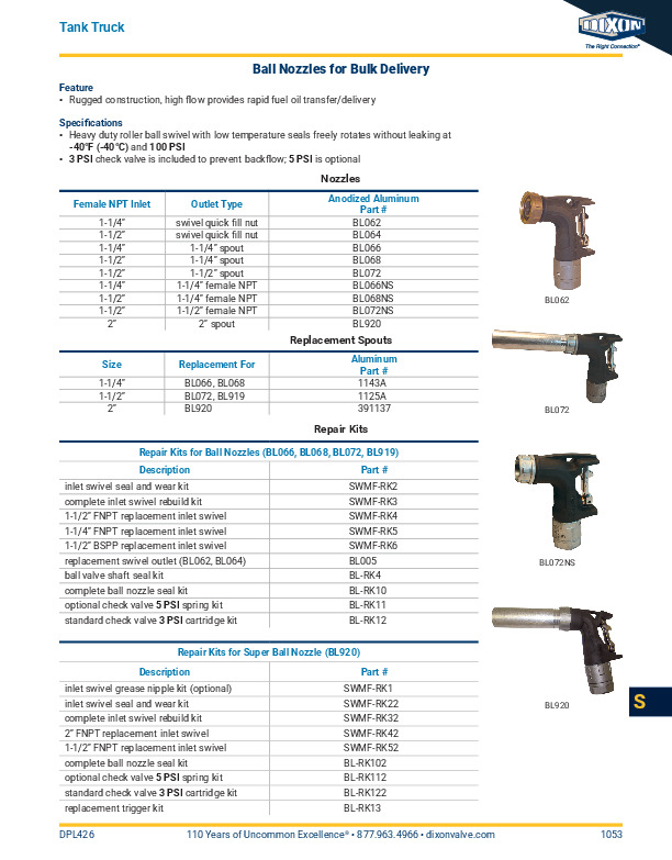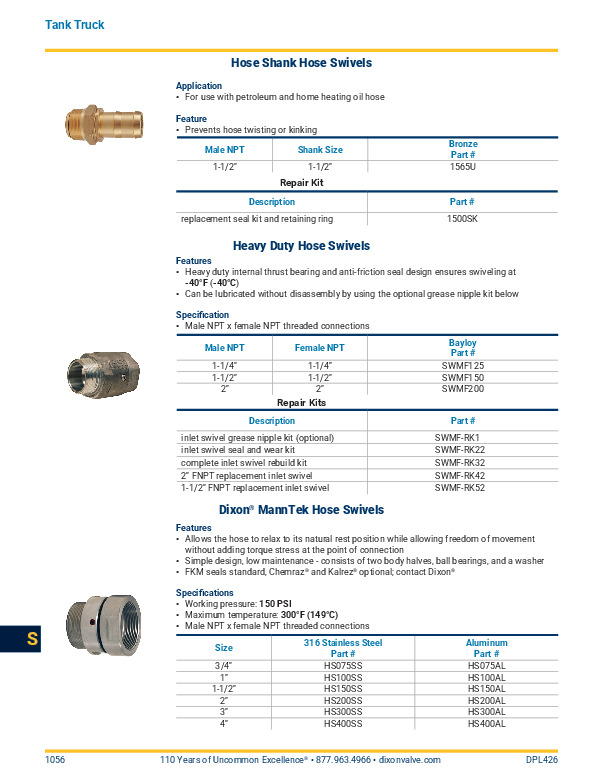 BL920 super ball nozzle, SWMF125, SWMF150, and SWMF200 heavy duty hose swivels