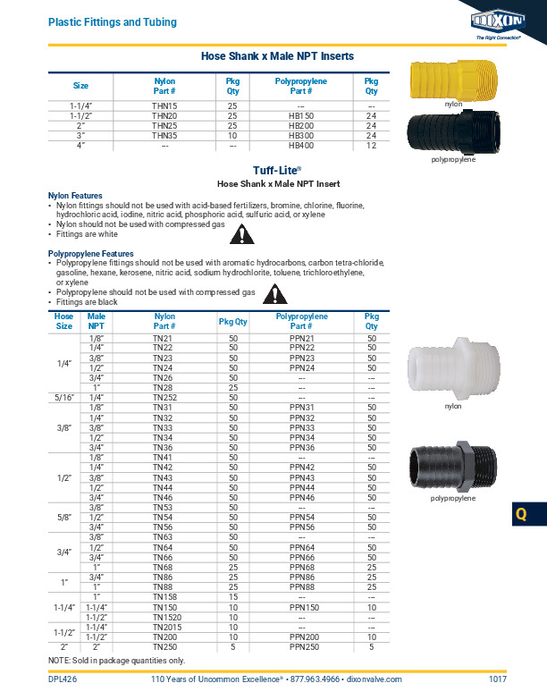• Polypropylene fittings should not be used with aromatic hydrocarbons, carbon tetra-chloride, gasoline, hexane, kerosene, nitric acid, sodium hydrochlorite, toluene, trichloroethylene or xylene.