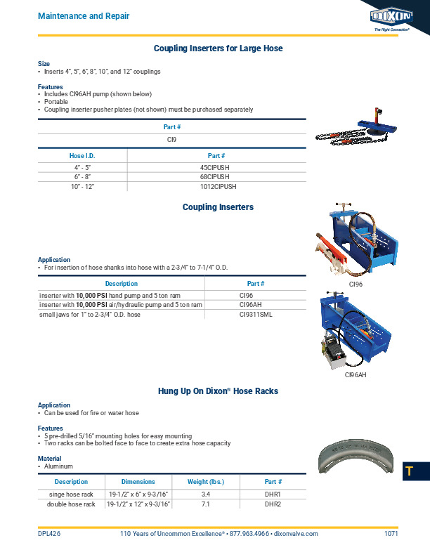 Coupling inserter pusher plates (not shown) must be purchased separately